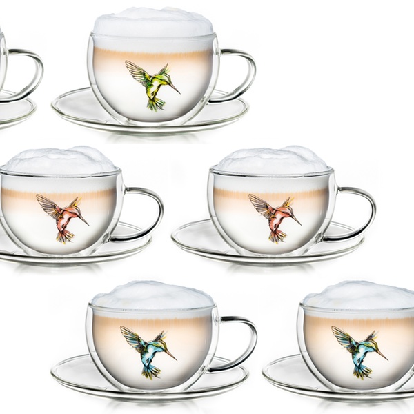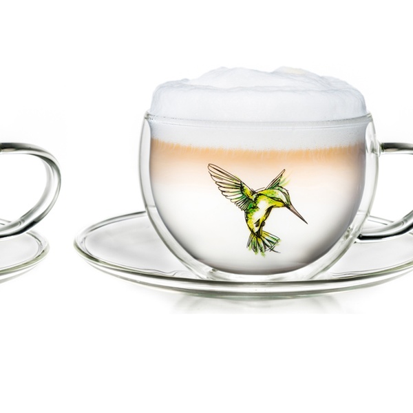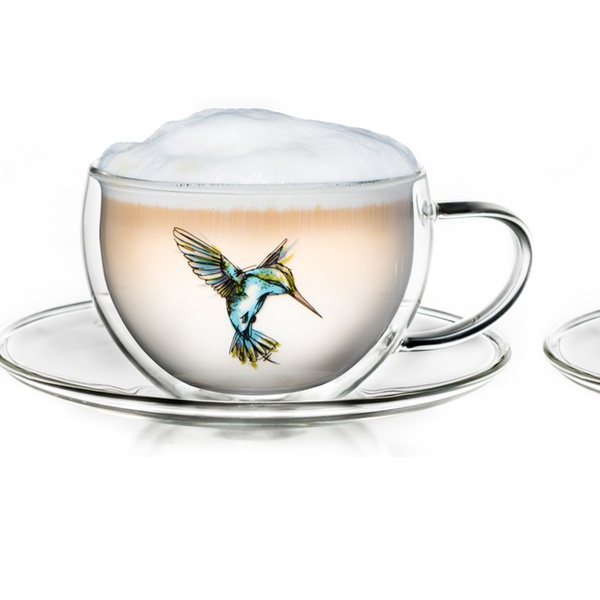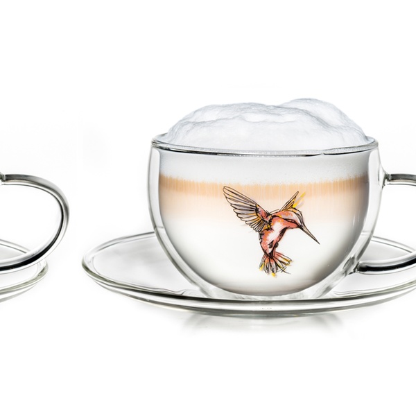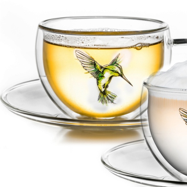 Stilvolle und robuste Thermotasse mit Untersetzer, sowohl neutral als auch im einzigartigen Kolibri-Design für Kalt- oder Heißgetränke