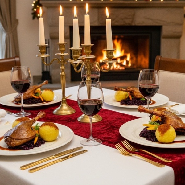 Festliche, saftige Ente oder veganes Wildgulasch mit Rotkraut, Kartoffelklößen & Rotwein – Zu dir nach Hause geliefert oder abholbereit