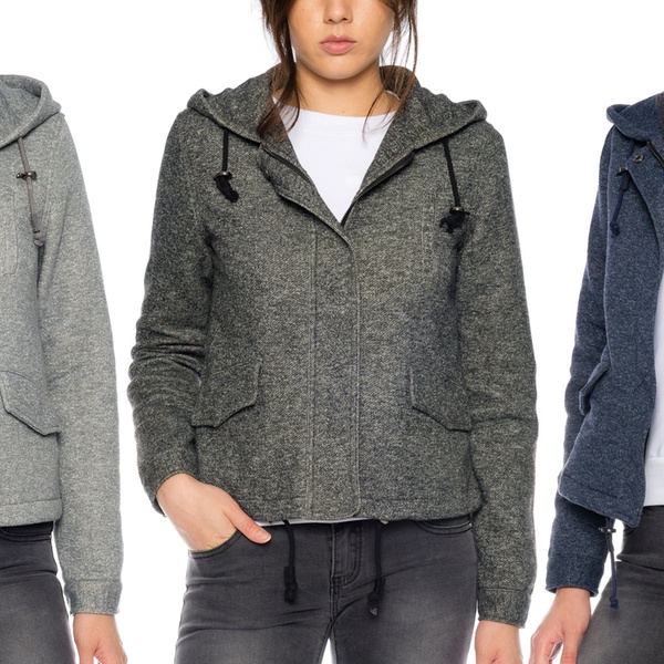 Eine modische und funktionale Übergangsjacke in Woll-Optik mit Reißverschluß und zwei vorderen Klapptaschen für Damen