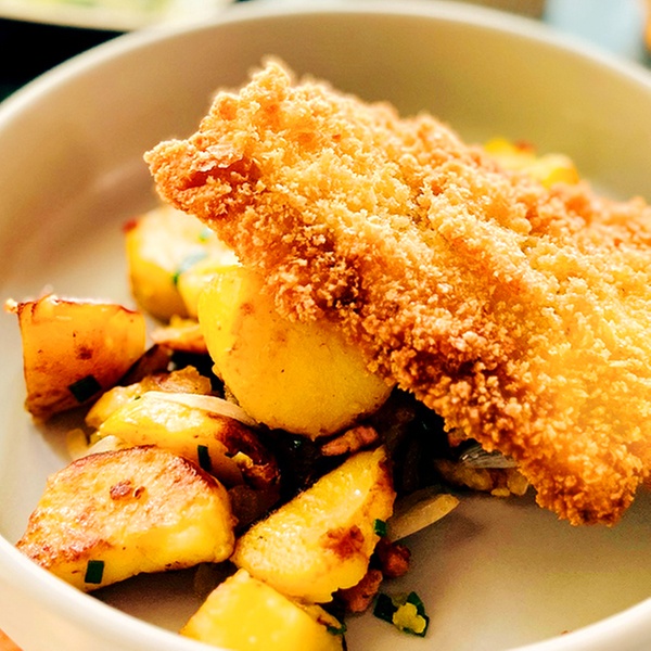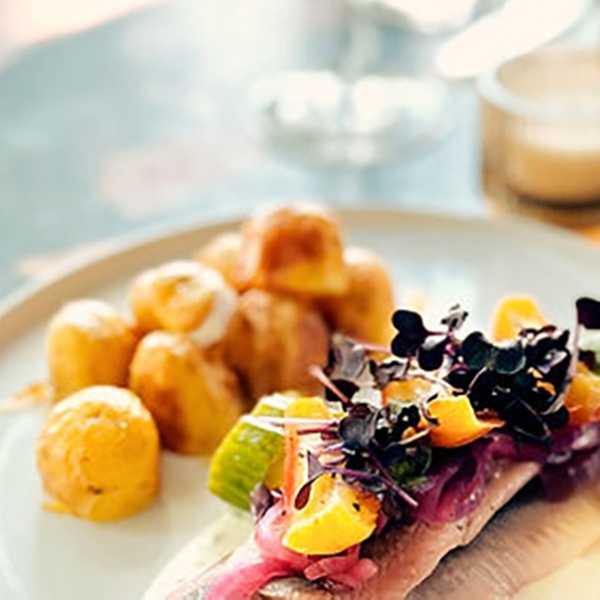 Kreativer 2-Gänge-Lunch aus wöchentlich neuer Karte – z. B. Kassler mit Sauerkirschjus & Schokomousse mit Pfirsichkompott