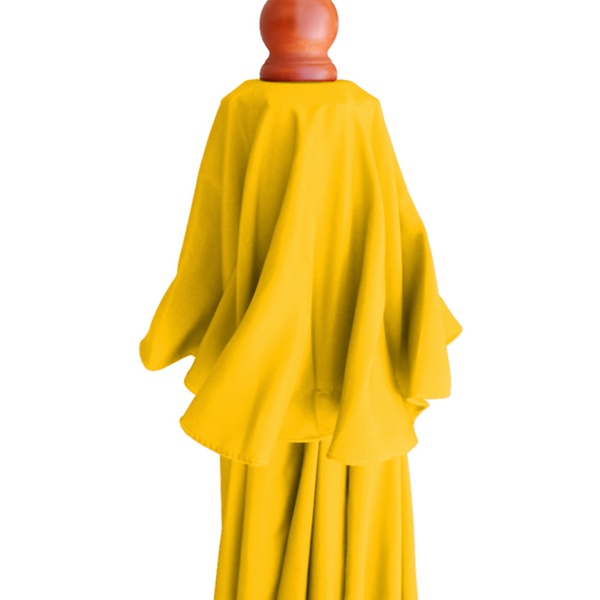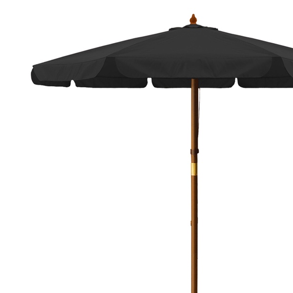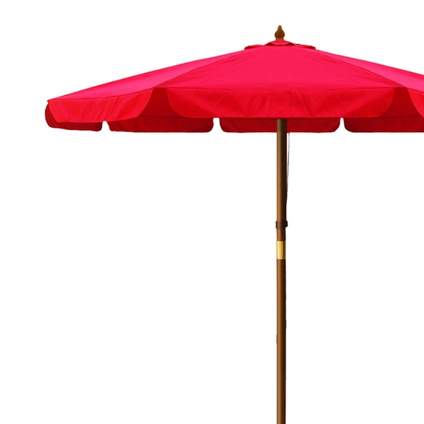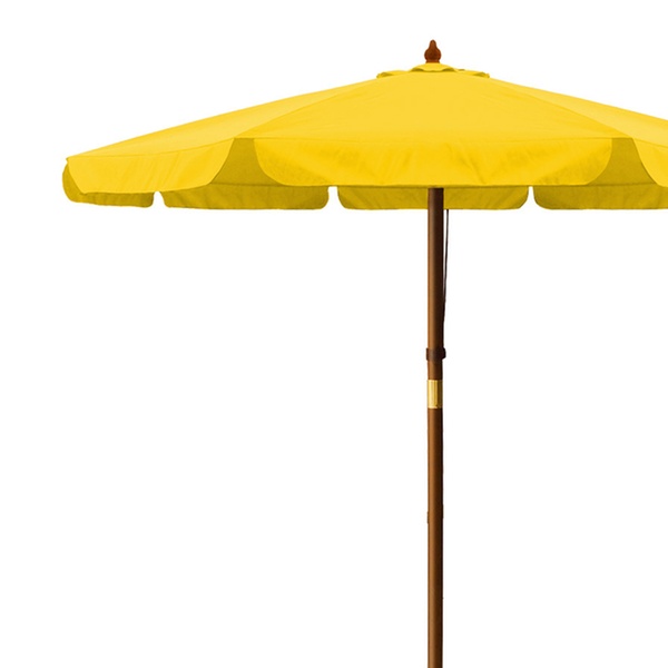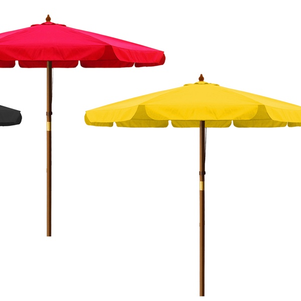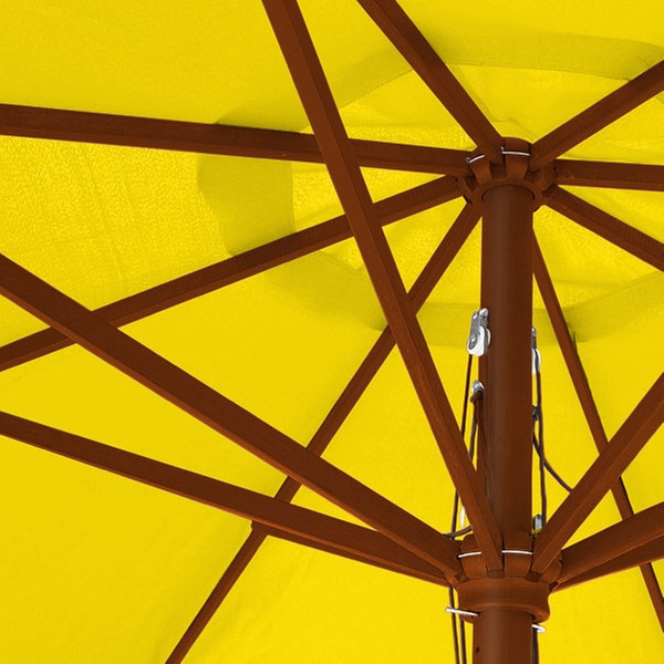 Ein Sonnenschirm mit Mast aus Holz, Windöffnung an der Oberseite und Seilzugsystem zum Öffnen und Schließen