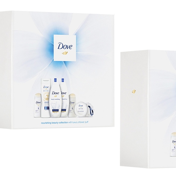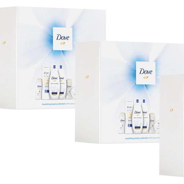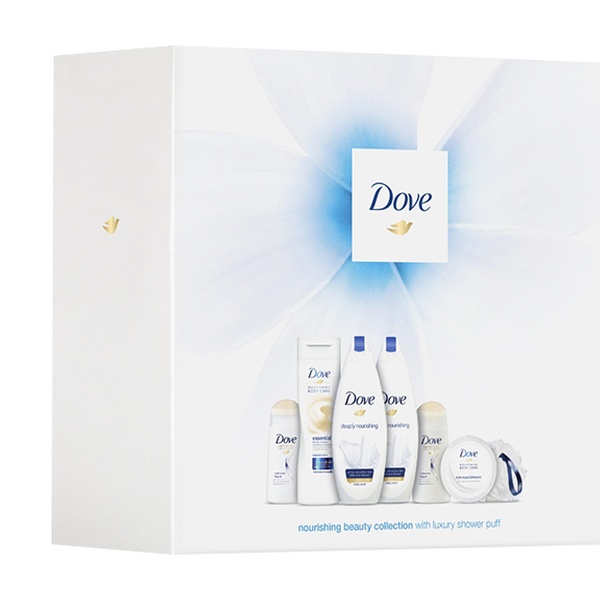 Ein Kosmetik-Set von Dove mit Duschgel, Shampoo, Körperlotion und Duschhauch, als gutes Geschenk geeignet