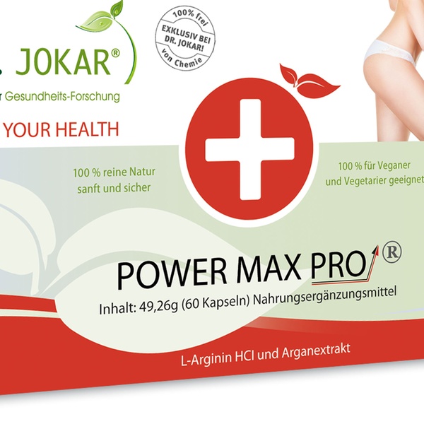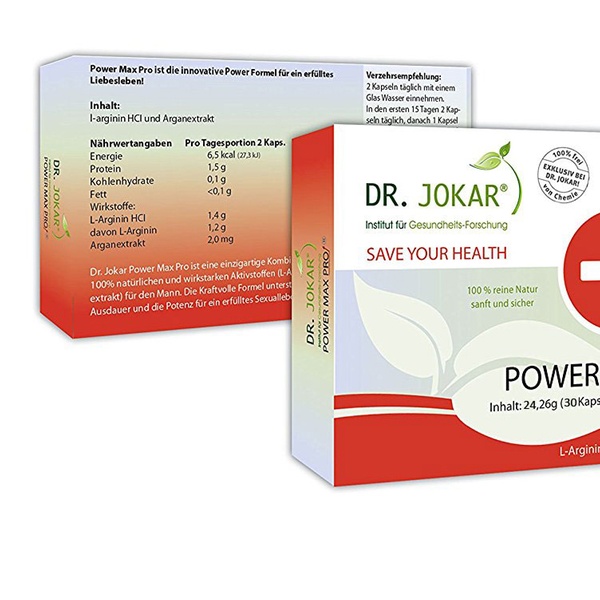 Dr. Jokar Power Max Pro ist eine Kombination aus 2 100% natürlichen und wirkstarken Aktivstoffen (L-Arginin und Arganextrakt) für den Mann