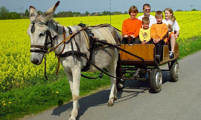 Beim Eselreiten oder Kutschfahrten erlebt die ganze Familie einen unvergesslichen Tag; mit Spielscheune, Strohburg und Restaurant