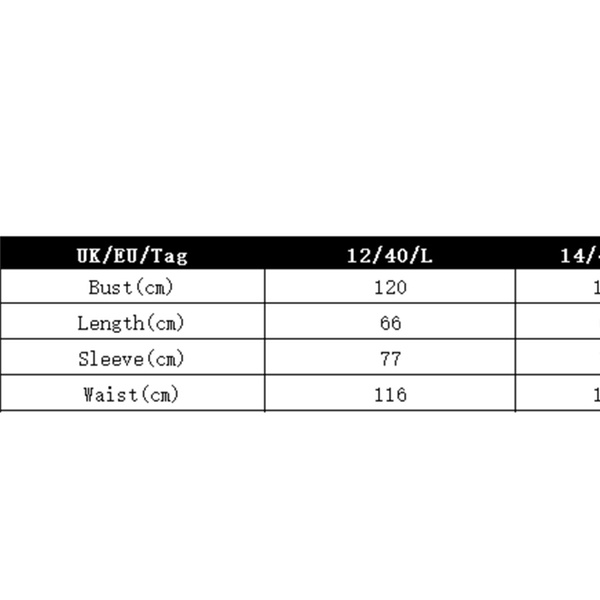 | Größe | Brustumfang | Länge | Ärmellänge | Taillenumfang |