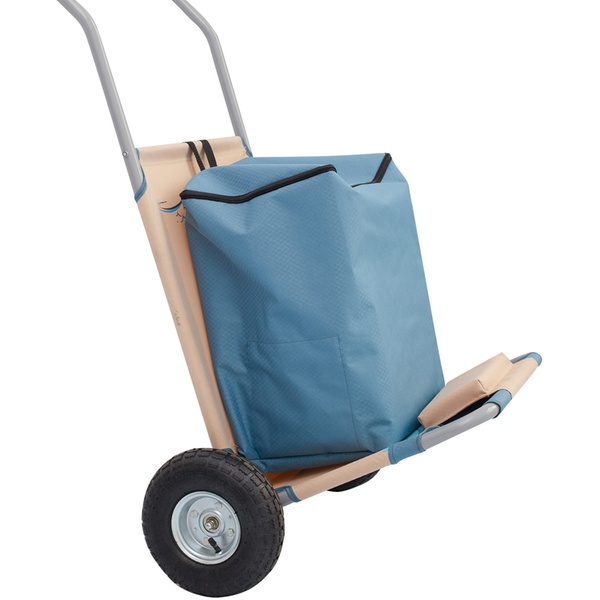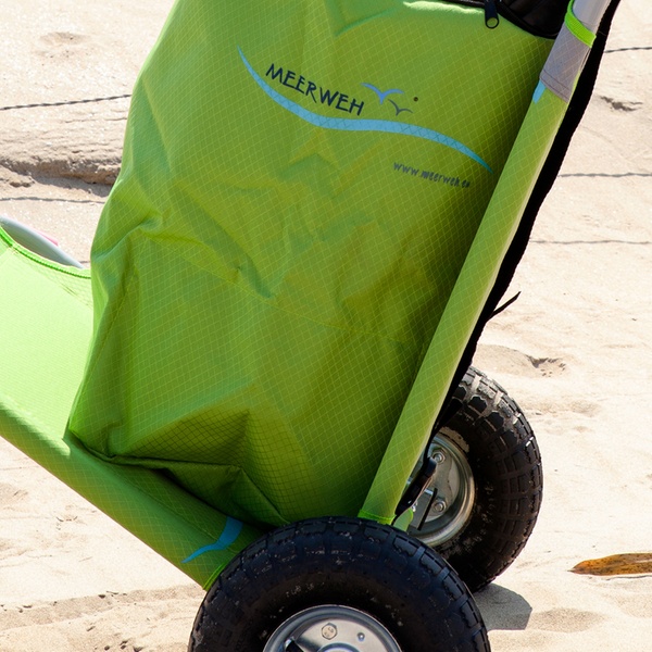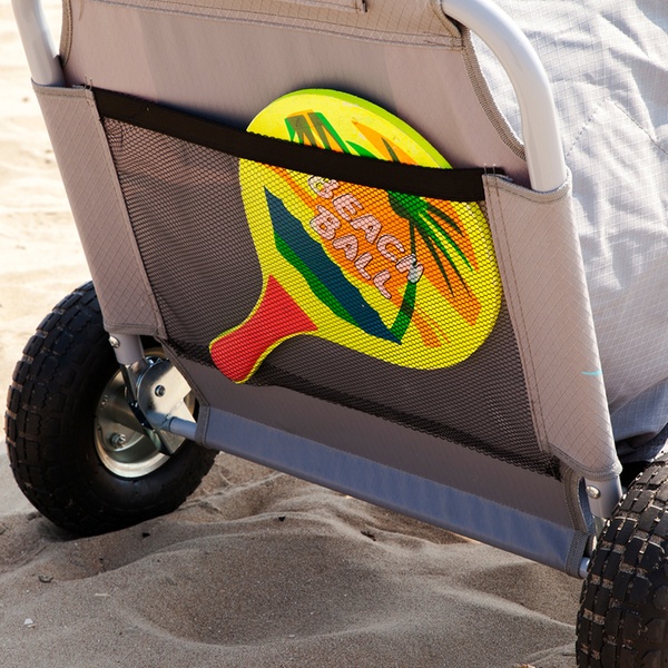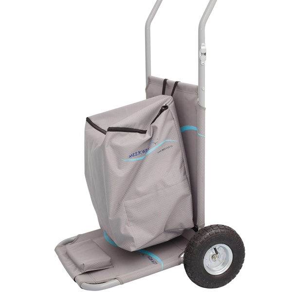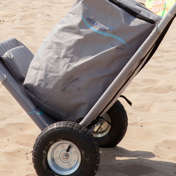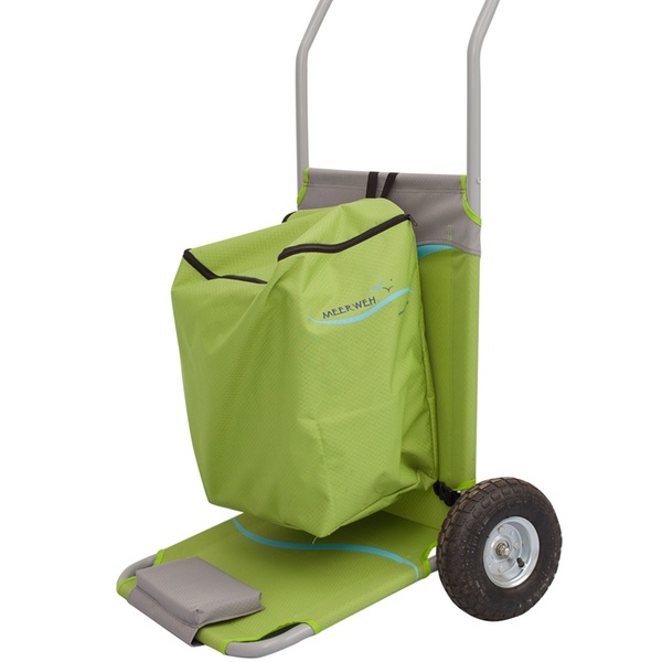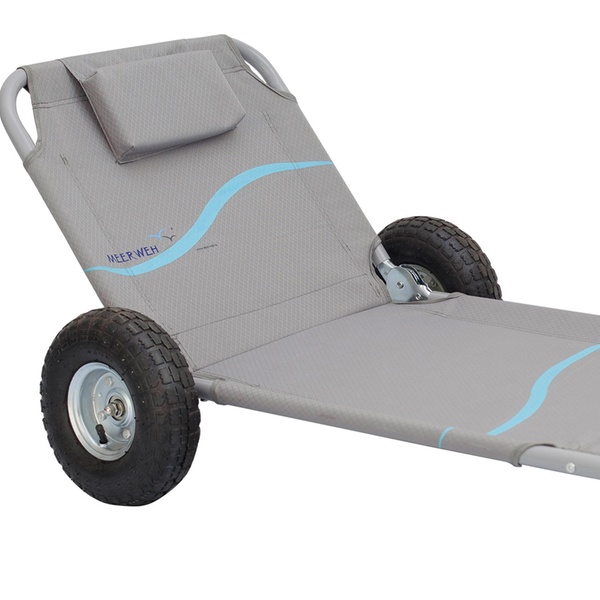 Praktischer Strandwagen, verwendbar als Strandliege oder Strandstuhl, mit verstellbarer Rückenlehne, Tasche und integriertem Flaschenöffner