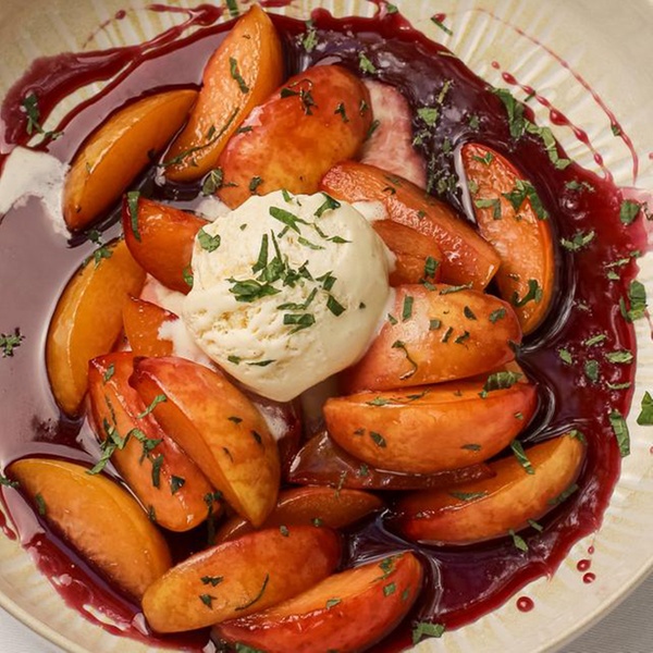- 3. Gang: Pfirsich in Wein mit 1 Kugel Eis
