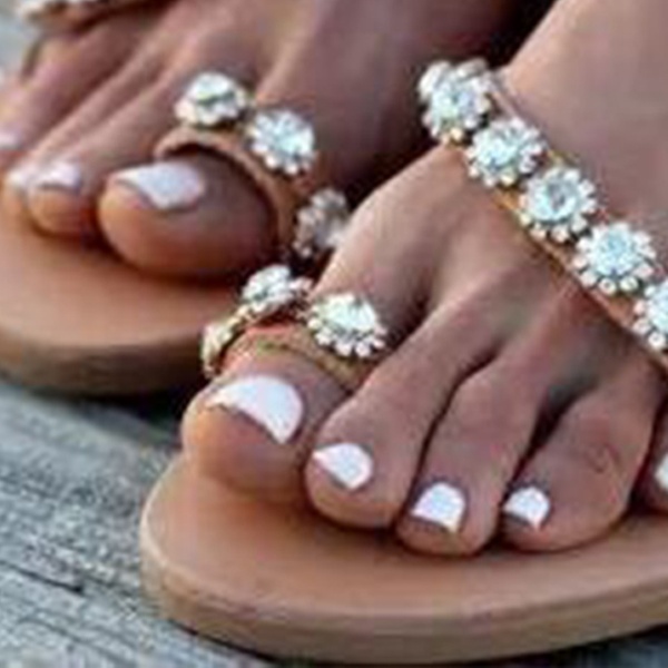 Feminine Sandalen mit flacher Sohne und dekorativem Blumen-Motiv aus glänzenden Strasssteinen