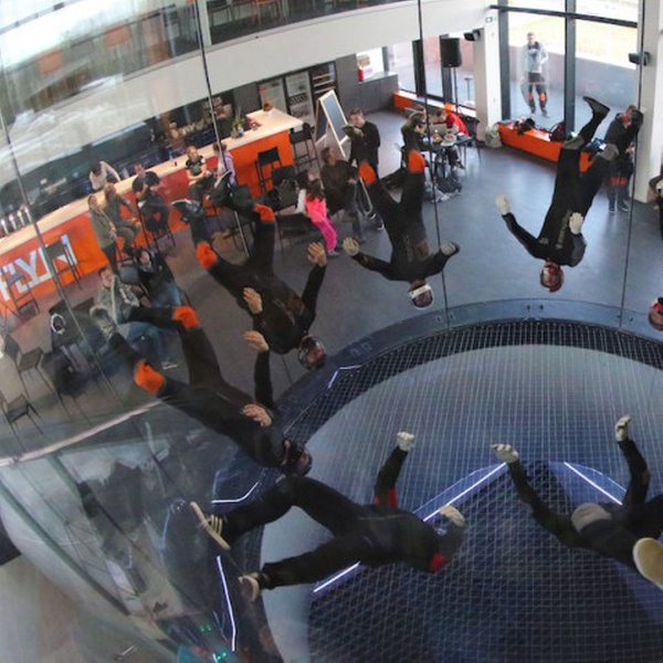 Auf dem Gelände des Flughafens Lüttich in Belgien wurde mit dem Indoor-Skydiving-Windtunnel ein ganz neues Freizeit-Konzept entwickelt. Durch den Windkanal mit 15 m Höhe und 5,2 m Durchmesser wird die Luft mit bis zu 300 km pro Stunde geblasen. Die Windkraft lässt mutige Teilnehmer aufsteigen, hoch schweben und das Gefühl der Schwerelosigkeit erleben. In der Anlage befinden sich mit Blick auf den Simulator auch eine Bar und ein Restaurant, in denen der kleine und große Hunger gestillt werden können.