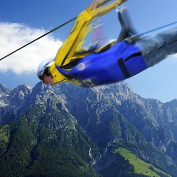 Die Teilnehmer gleiten in Bauchlage 1,6 Kilometer über das Tal mit bis zu 130 km/h in 143 Metern Flughöhe durch eine fantastische Bergwelt