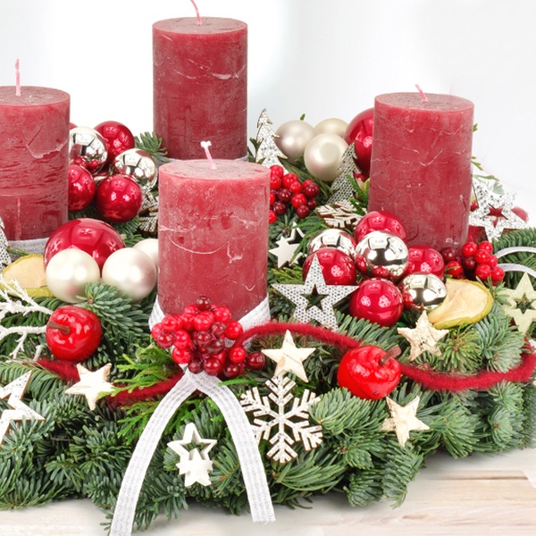 - Weihnachtliche Dekoration (u.a. Weihnachtskugeln, Spiegelbeeren, dunkelrote Filzschleifen, Beeren, Äpfel, rote Zapfen, rote Glitzersterne)