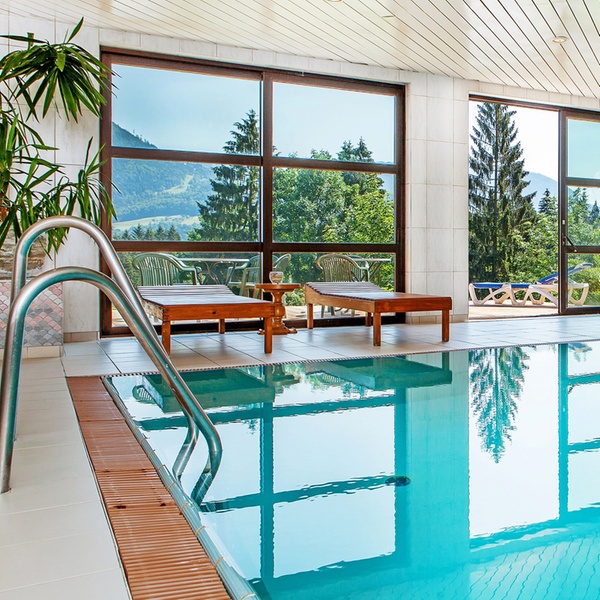 Darüber hinaus verfügt das Hotel über ein Hallenbad mit Panoramafenster sowie einen Wellnessbereich mit einer 60 C° Bio-Sauna, einer 90 C° Panorama-Sauna, einem Dampfbad und einem Ruheraum.