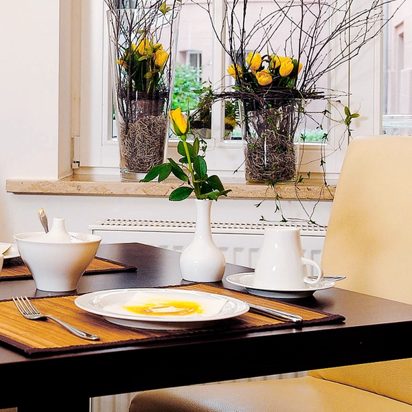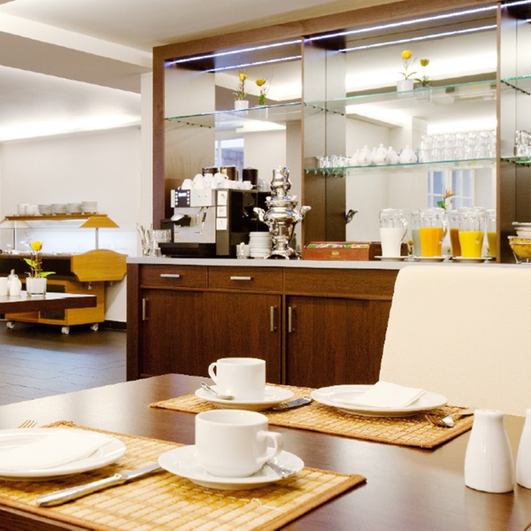 Morgens stärken sich die Gäste am reichhaltigen Frühstücksbuffet im stilvollen Hotelrestaurant.