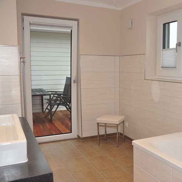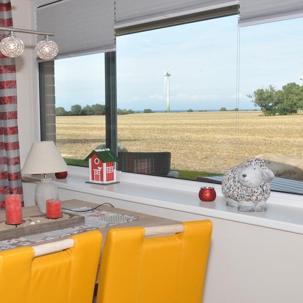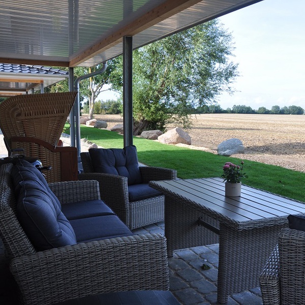 Die Urlauber können die frische Landluft und die berühmte Ostseebrise auf der großzügigen Terrasse mit Gartenmöbeln, Sonnenschirm, Strandkorb und Grill genießen.