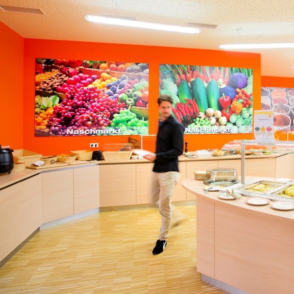 Im Hotelrestaurant können Gäste am Buffet verschiedene Gerichte der internationalen Küche genießen.