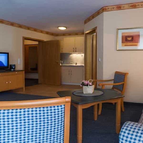 Die Wohnungen mit 2 Räumen haben einen großen Wohnraum mit Schlafsofa, Telefon, Fernseher und Essplatz mit 4 Stühlen. Zur voll ausgestatteten Kochnische (Geschirr und Besteck) gehören ein 2-Platten-Elektroherd, ein Kühlschrank und eine Kaffeemaschine. Das Schlafzimmer ist mit Doppelbett, Schrank und Schreibtisch ausgestattet und das Badezimmer hat eine Dusche.