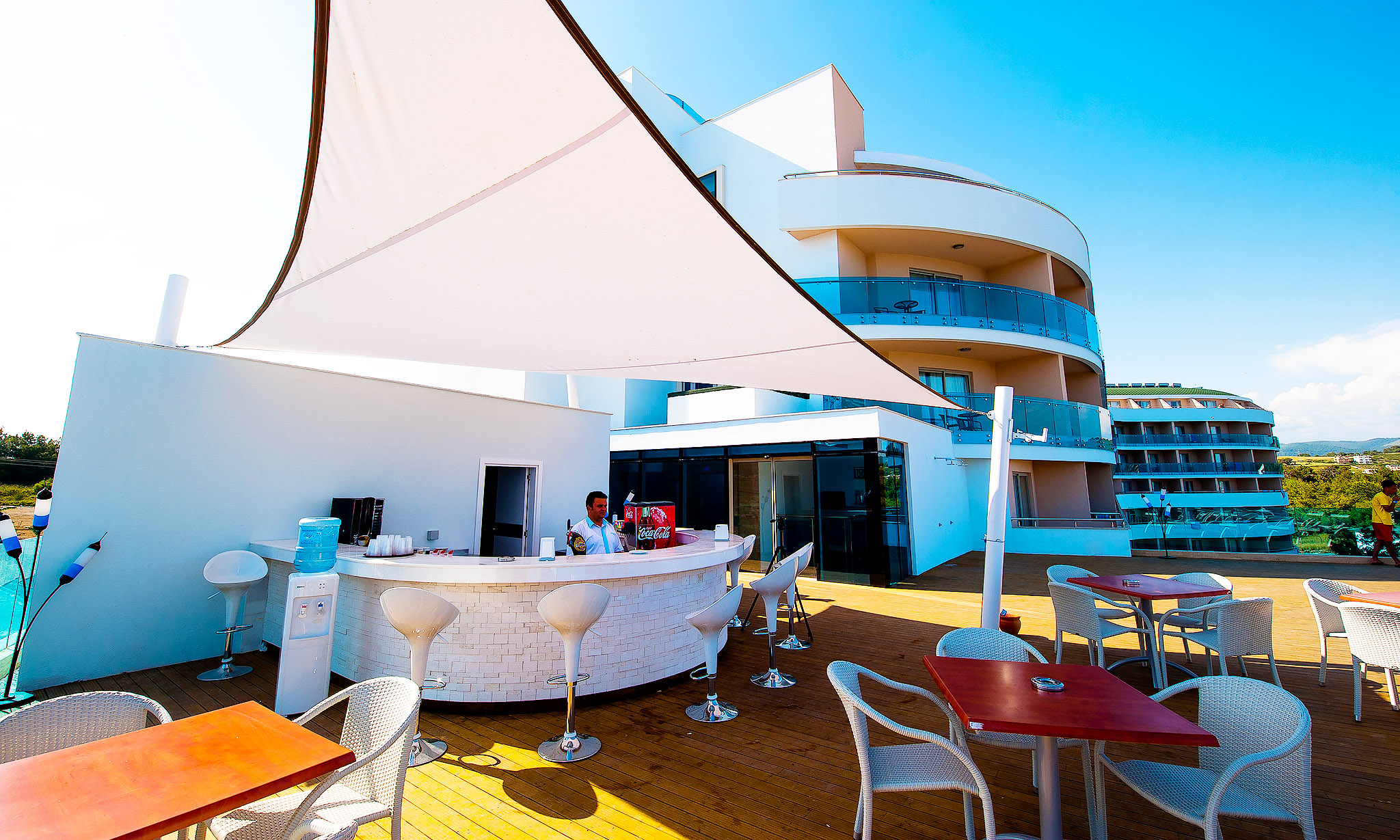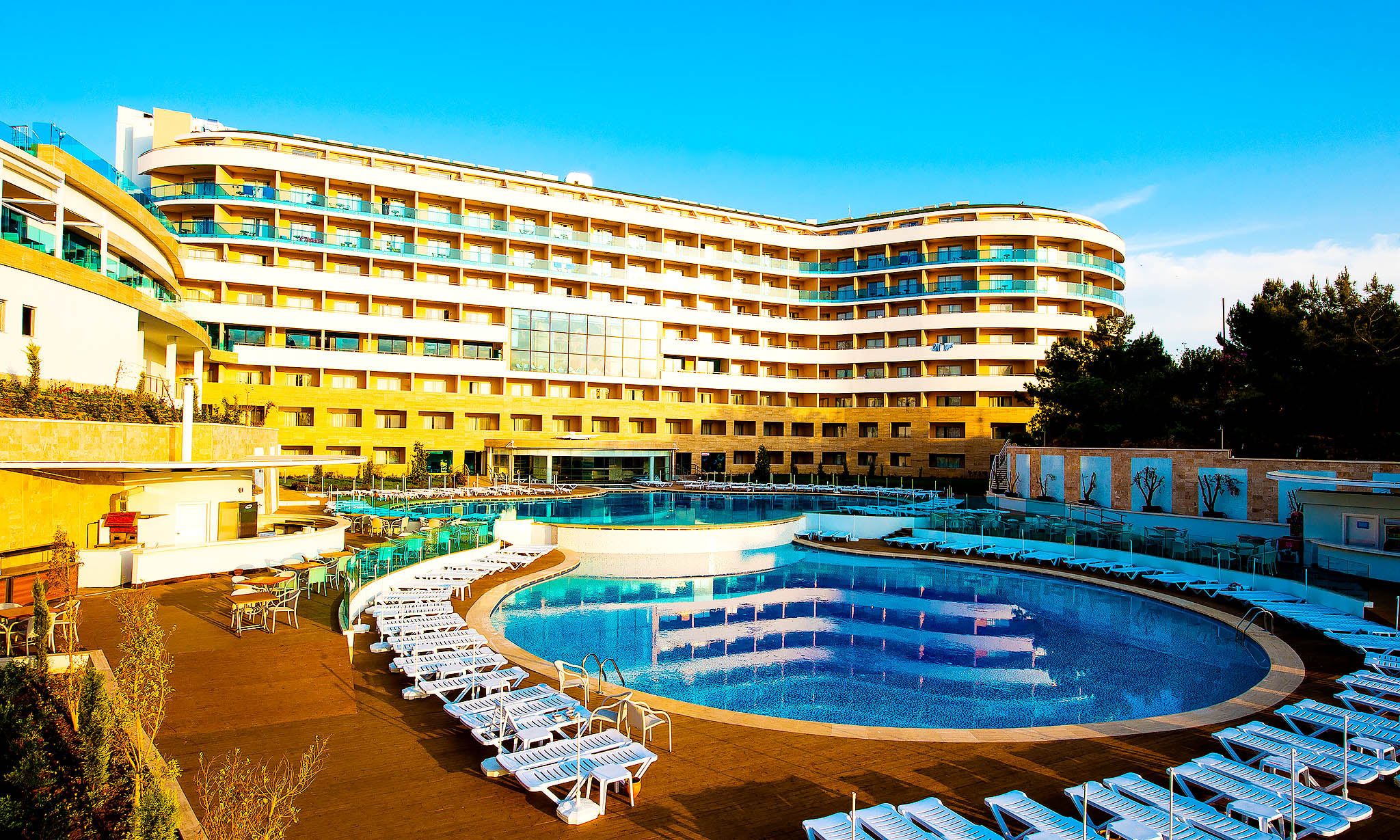 Das Hotel Water Planet Deluxe ist eine weitläufige Anlage mit Außenpools und ganzen 16 Wasserrutschen im Aquapark. Auch Freizeitmöglichkeiten für Tennis und Fitness gehören zum Resort. Im Wellnessbereich lassen es sich die Gäste beispielsweise in der Sauna gut gehen und nutzen die Spa-Einrichtungen. Die mit Parkett ausgestatteten Einzel- und Doppelzimmer sind geschmackvoll eingerichtet und mit Klimaanlage, kostenfreiem WLAN-Zugang und einem Balkon ausgestattet. Im Rahmen der Halbpension wird das Frühstück und das Abendessen im Restaurant mit Innen- und Außenbereiche serviert. Beide Restaurants verwöhnen zudem nach Wunsch mit osmanischer Küche sowie Fischgerichten.