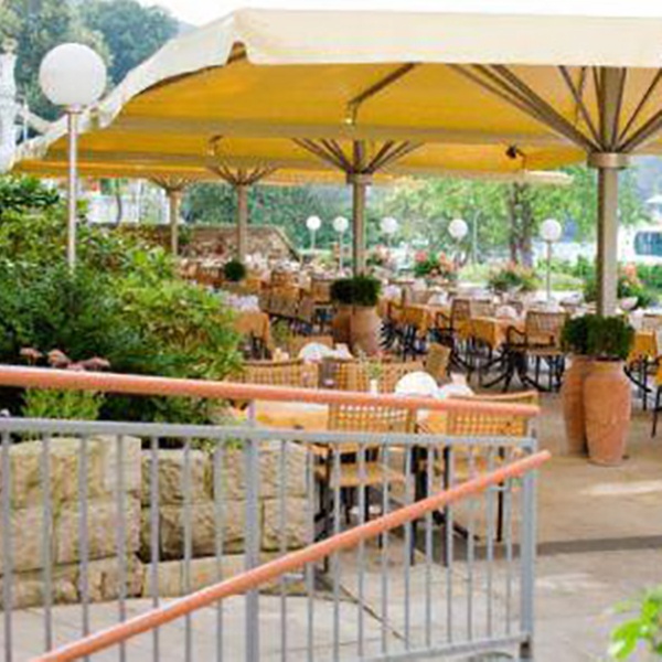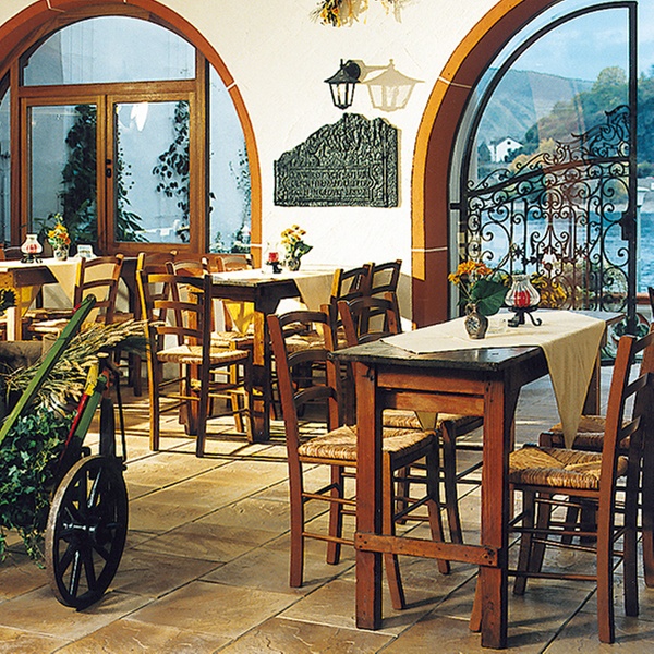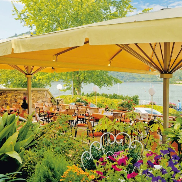Bei schönem Wetter und an wärmeren Tagen laden die hoteleigenen Rheinterrassen zum Genuss rheintypischer Gerichte, regionalen Weinen oder zum Kaffee und Kuchen ein.