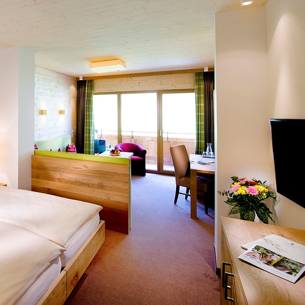 - In warmen Farben und mit viel hellem Holz eingerichtete Junior Suite mit Badewanne und Dusche, gemütlicher Sitzgelegenheit und Balkon auf 40 qm