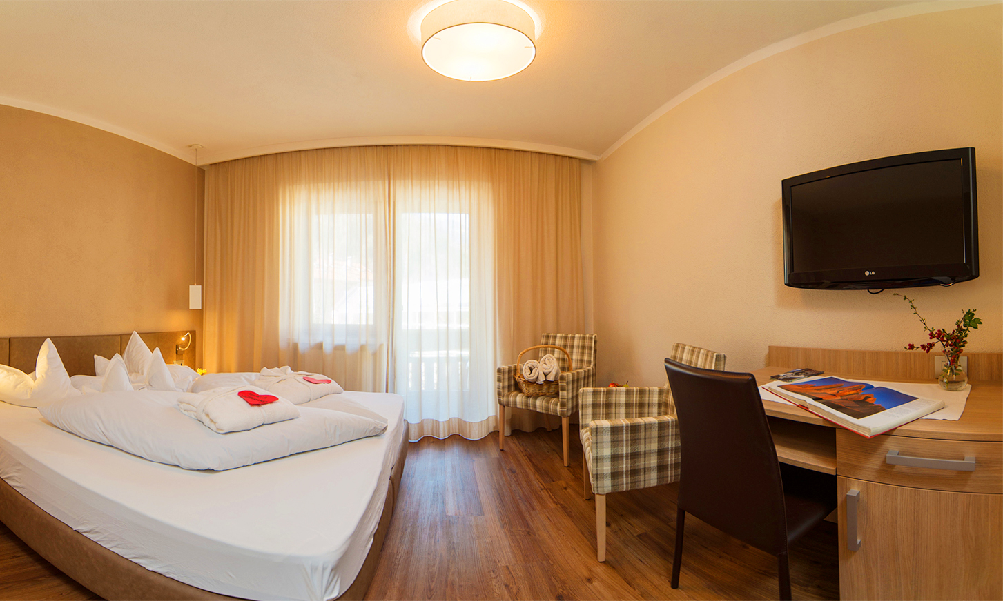 Zeit zum Träumen: Das Hotel Mühlener Hof in Mühlen/Sand in Taufers bietet in gemütlichen Doppelzimmern angenehmen Wohnkomfort mit Direktwahltelefon, Sat-TV, Radio, Zimmersafe, Badezimmer mit Föhn, kuscheligen Bademänteln und Wellness-Badetüchern sowie teilweise Balkon. Zeit zum Genießen: Wenn aus klassischer Halbpension eine „Dreiviertel-Pension“ wird, dann ist das echte „Mühlener Ferienqualität“. Die Gäste genießen während des Aufenthalts das reichhaltige Frühstücksbuffet mit Bio-Ecke und Bauernprodukten, abends viergängige Menüs nach Wahl mit knackigen Salaten und schmackhaften Dressings vom Buffet. Abgerundet wird das kulinarische Verwöhn-Programm von einem Nachmittagsbuffet mit kalten Speisen oder Kuchen (außer Dienstags).