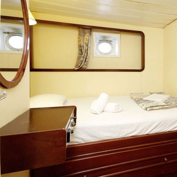 - Kabinen verfügen über Einzelbetten, Etagenbetten oder ein französisches Bett (Breite ca. 130-140 cm) sowie Dusche/WC, Klimaanlage, Kleiderschrank oder offene Ablage, Leselampen und 220-Volt-Steckdose; sie befinden sich sowohl im Unterdeck als auch auf dem Deck