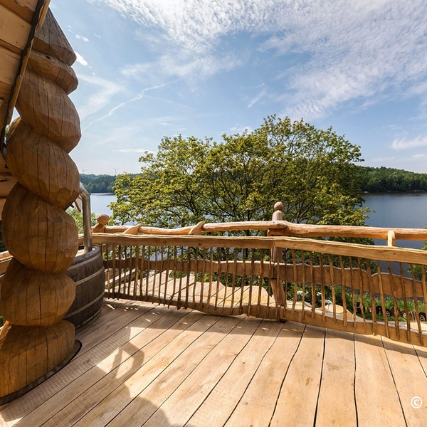 Das Baumhaushotel im Kriebelland befindet sich an einem Talsperre-See. Die individuell gestalteten und völlig einzigartigen Baumhäuser befinden sich in etwa 3-20 Meter Höhe über dem Boden und sind über einen Treppe-Steg erreichbar. Unweit vom Baumhaushotel erstrecken sich Wälder zum Erkunden und Städte wie Chemnitz, Dresden oder Leipzig, die in weniger als 60 Minuten mit dem Auto erreichbar sind. Das fest stehende, 83 qm große Romantik-Baumhaus befindet sich in 28 Meter Höhe, eingespannt in 180 Jahre alte Eichen. Auf der 1. Etage sind ein Flur, ein Kaminzimmer mit Schlafsofa für 2 Erwachsene, ein Schlafzimmer mit Himmelbett für 2 Erwachsene und ein Mädchenbad (mit Fußbodenheizung, Gießkannendusche und Flusssteinbecken). Die zweite Ebene hat eine große Wohnküche mit Schlummereckcouch für 2 Erwachsene und eine Sonnenterrasse Die 3. Etage verfügt über einen großen Schlafboden mit Blick zum See für 2 Erwachsene. Das Bücherwurm-Baumhaus ist eine frei hängende Einrichtung (3x2 Meter), das Fass-Baumhaus hingegen eine fest stehende (5x3 Meter).