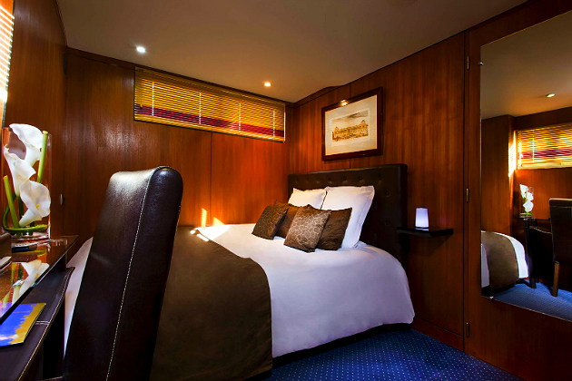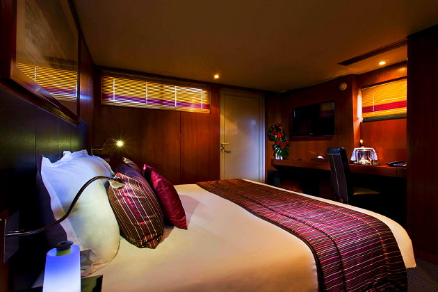 Das elegante Jachthotel hat seinen Anlegeplatz in der Nähe vom Gare de Lyon und Gare d’Austerlitz direkt an der Seine und fährt von dort aus in gemächlichem Tempo an den Sehenswürdigkeiten von Paris entlang. Notre Dame, der Eiffelturm, die Tuilerien und nicht zuletzt die vielen steinernen Brücken ziehen, abendlich beleuchtet, vor der großen Fensterfront im Panoramarestaurant vorbei, während die Gäste exquisite Köstlichkeiten genießen. Je nach gewählter Option verbringen sie anschließend auch die Nacht an Bord. In der luxuriösen Kabine schaffen Mahagoni und kräftige Farben ein ansprechendes Ambiente zum Wohlfühlen. Ausgestattet ist die Standard-Kabine mit einem Queensize-Bett, Klimaanlage, Mahagonischreibtisch, WLAN, LCD-Fernseher, Minikühlschrank sowie Bad mit Dusche und WC.
