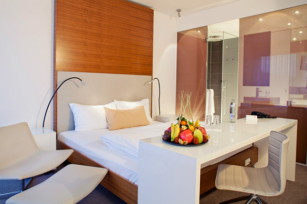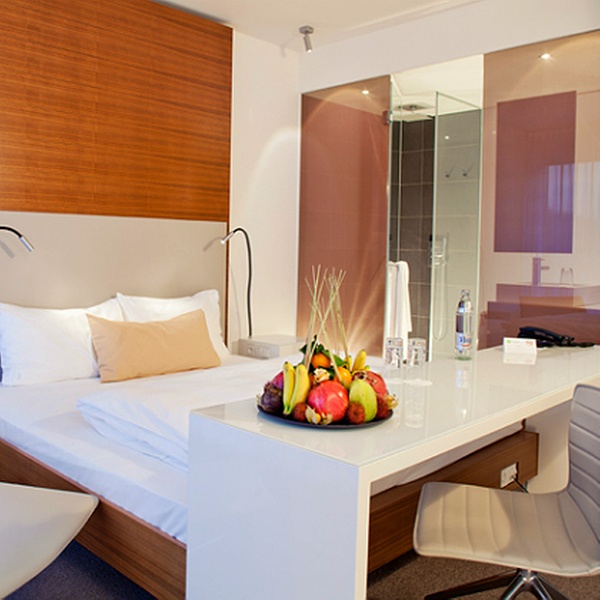 Direkt am Parc d‘Activité Syrdall begeistert das Légère Premium Hotel inkl. Lounge, Bar und Restaurant mit exquisitem Ambiente. Für die Einrichtung der 25 qm großen Doppelzimmer mit gemütlichem Kingsize-Bett, LCD-Fernseher und individuell einstellbarer Klimaanlage kamen hochwertige Materialien zum Einsatz. Die warmen Holztöne und Crèmefarben schaffen zusammen mit dem natürlichen Licht, das durch die großen Fenster scheint, eine einladende Atmosphäre. WLAN- und DSL-Internetzugang sowie die Softgetränke in der Minibar sind durchgehend kostenlos enthalten. Highlight ist das stylishe Badezimmer mit offenem Wohnbad samt Fußbodenheizung, Rain-Shower-Dusche und Haartrockner.