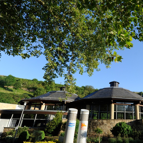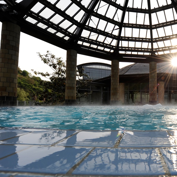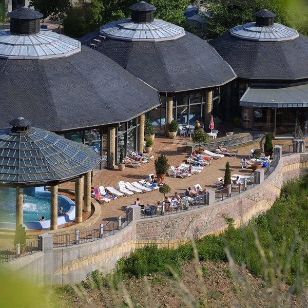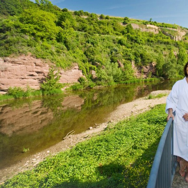 Das Thermalbad Crucenia Therme im Herzen des Bad Kreuznacher Kurviertels, liegt idyllisch direkt am Naheufer entfernt in der reizvollen Landschaft. Von der der Freiterasse des Thermalbads haben die Gäste einen herrlichen Blick auf die Nahe, die rötlichen Felsen und Weinberge des Kauzenbergs.