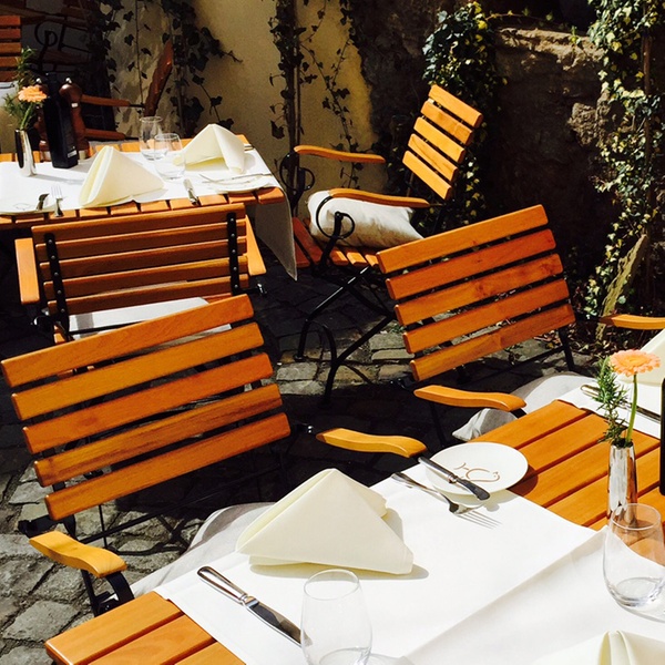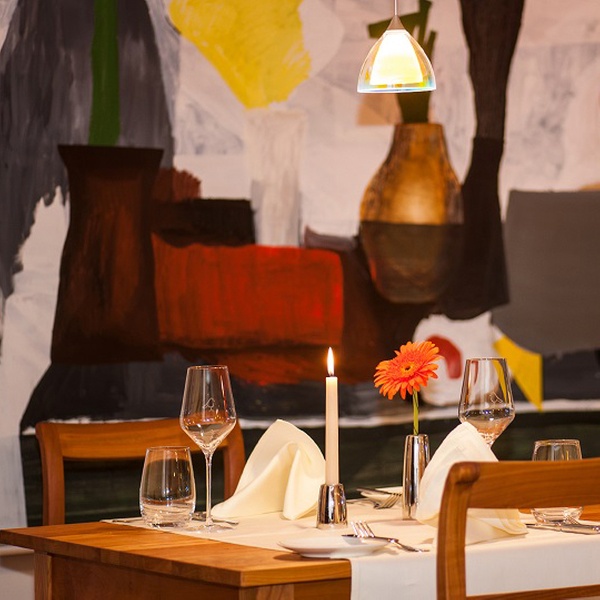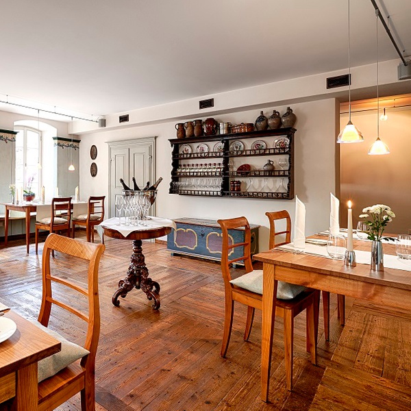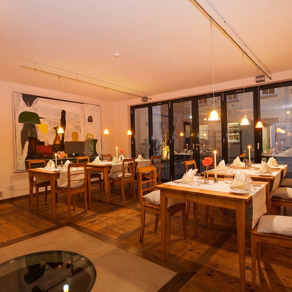 Das Hotelrestaurant nimmt fast das ganze Erdgeschoss ein und ist in drei Teile gegliedert, von denen jeder einen anderen Charakter hat. Im Gastraum „Zur Blume“ ist der Boden ein charaktervoller Felderboden mit originalen Holzdielen aus dem Haus. Die Wände in der Blume sind mit einer Täfelung aus dem 18. Jahrhundert versehen. Im Jägerzimmer tafeln Sie unter den Augen einer Bronzestatue der Diana und zwischen Rehgehörnen aus dem Meisenheimer Forst. Die Brunnenstube hat ihren Namen nach einem mittelalterlichen Quellbrunnen, der sich mit einer Glasplatte abgedeckt mitten im Restaurant befindet. Im Sommer öffnen wir die Glaswand zum Innenhof an der Stadtmauer, wenn Sie nicht ganz draußen speisen wollen, sitzen Sie hier windgeschützt an frischer Luft. In der kalten Jahreszeit bietet der Raum eine warme anheimelnde Atmosphäre mit Einrichtungsdetails wie einer Rokoko-Nußholzanrichte aus der Zeit um 1770 und der charaktervollen originalen Barocktür aus der berühmten Schmidtwerkstadt. Kulinarisch verwöhnt das Haus seine Gäste morgens mit einem üppigen Frühstücksbuffet und abends mit Gerichten aus regionalen Naturprodukten.