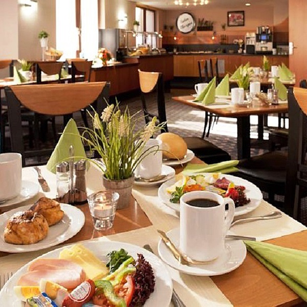 - Im Frühstücksrestaurant wird täglich ein reichhaltiges Frühstücksbuffet serviert.