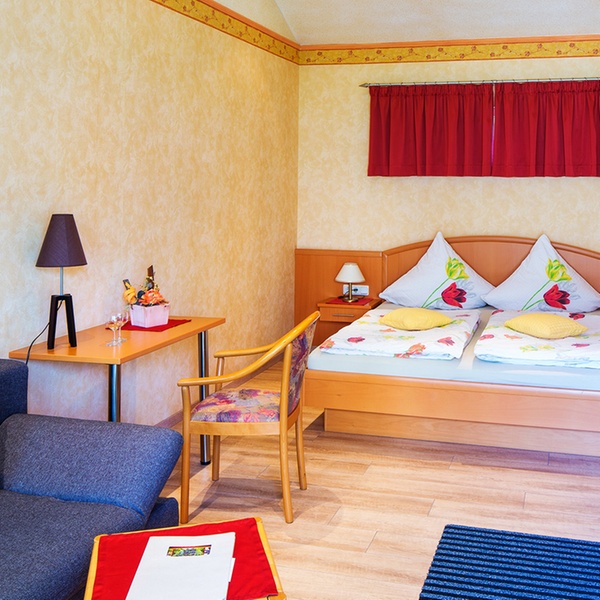 Die Doppelzimmer haben eine Terrasse, einen Balkon oder eine Loggia. Alle Zimmer sind allergikergeeignet und besitzen TV, Schreibtisch und Minibar. Sie verfügen über eigenes Bad mit Dusche, Hygiene-Artikeln, Haartrockner und WC. Die Wanderer finden auf den Zimmer solche nützliche Kleinigkeiten wie Rucksack und Wanderkarten. Im Hotel gibt es auch einen Trocken- und Abstellraum für nasse Kleidung. Die Gäste können ihre Fahrräder und Motorräder kostenfrei unterstellen.