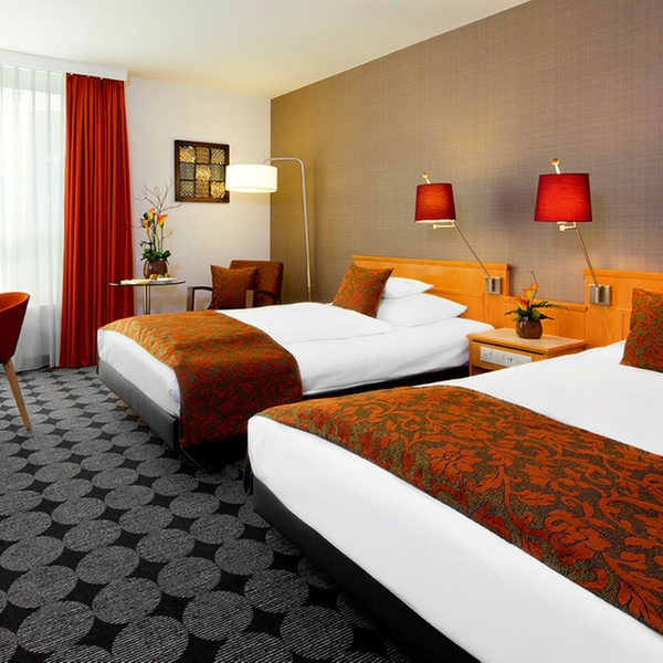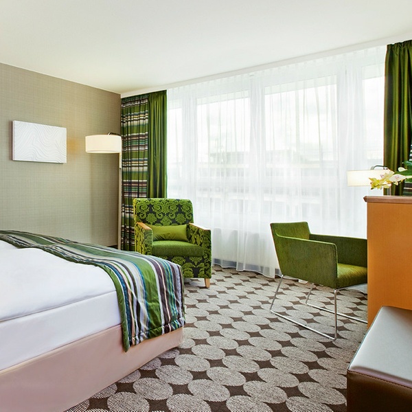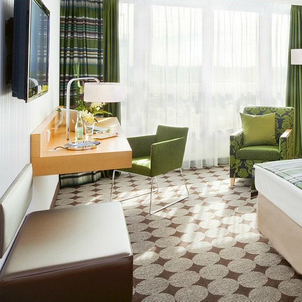 Die stilvoll eingerichteten Komfort-Doppelzimmer im Mövenpick Hotel Nürnberg Airport bestechen durch modernes Design und einen individuell-eleganten Touch. Das frische Ambiente begrüßt die Reisenden schon bei der Ankunft. Auf 27 Quadratmetern residieren Gäste mit einem Kingsize-Bett oder zwei Einzelbetten. Zur Ausstattung gehören neben einer Klimaanlage auch ein Tee- und Kaffee-Zubereiter, Telefon, TV mit HD-Auflösung und internationalen Programmen sowie Sky Movies, Zimmersafe, Föhn und lichtdichte Vorhänge.