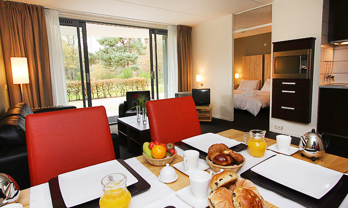 Mit ihrer komfortablen und modernen Ausstattung bieten die 3-Raum-Apartments im Sandton Resort Bad Boekelo alles, was man für einen angenehmen Aufenthalt benötigt. Auf stolzen 58 qm sind neben einem gemütlichen Wohnzimmer auch zwei separate Schlafzimmer mit je zwei Einzelbetten und eine vollausgestattete Küche mit Keramikherd, Kombi-Mikrowelle, Spülmaschine und Kühlschrank untergebracht. Von den zwei Badezimmern ist eines mit Wanne und das andere mit Dusche ausgestattet. Auf der Terrasse bzw. dem Balkon finden sich bequeme Stühle, auf denen man bei schönem Wetter die Sonne und den Blick auf die Umgebung genießen kann. Wer nicht selbst kochen möchte, hat im Restaurant Moods die Wahl zwischen verschiedenen regionalen oder ausgefallenen internationalen Gerichten.