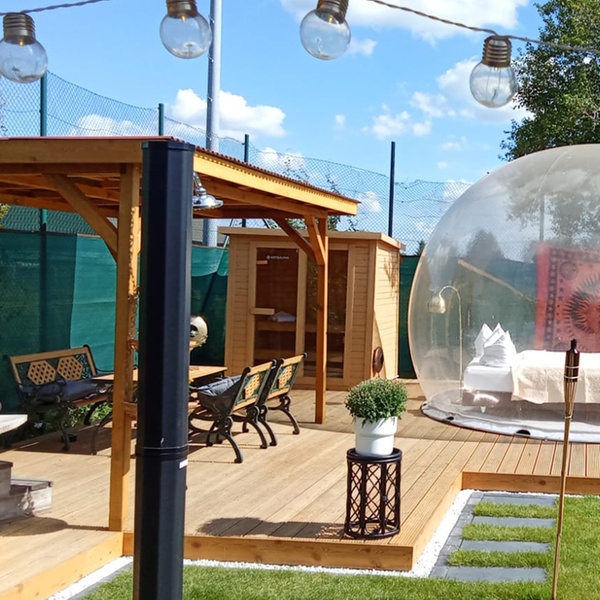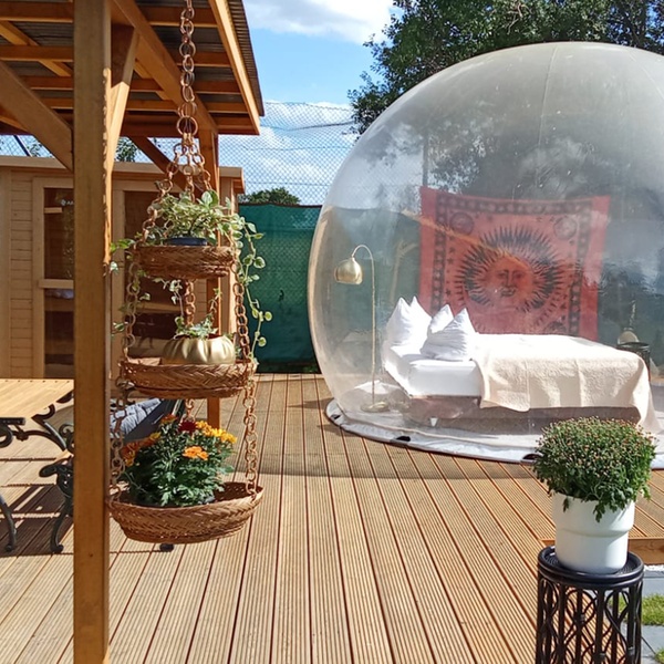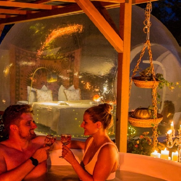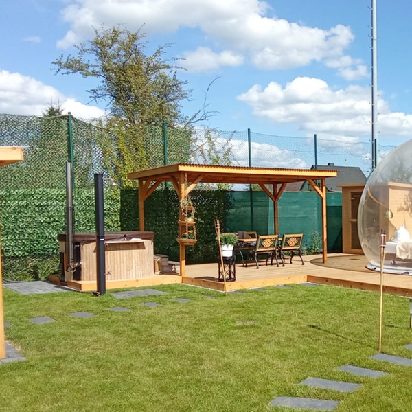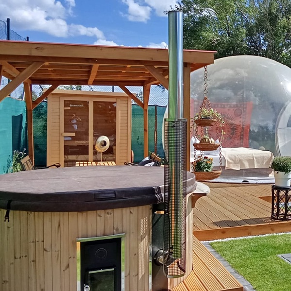 - Nacht – Bubble Tent im Wellnessgarten mit privatem Garten, Holzofen-Whirlpool, privater Sauna, romantischen Kerzen, Außenküche, Liebesschaukel, Hot-Stone-Massage, Massagekerze