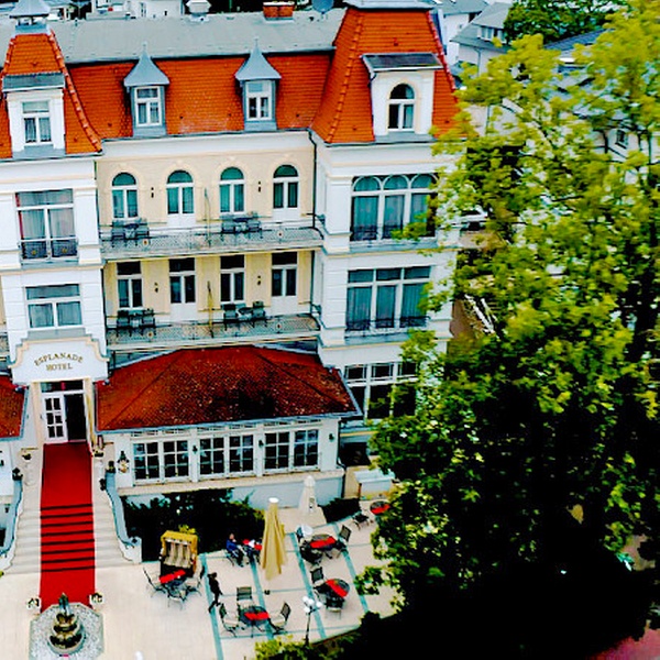 Das Hotel Esplanade liegt mittendrin im Zentrum des Seebades Heringsdorf und in unmittelbarer Nähe zum endlosen Ostseestrand. 1896 als Liebesbeweis für seine Angebetete von einem Hohenzollernprinzen als Schloss Dorothea erbaut, zeigt das bekannte Hotel in Heringsdorf über ein Jahrhundert später immer noch einen ganz besonderen Zauber. Die Fassade im Jugendstil ist ein beliebtes Fotomotiv.