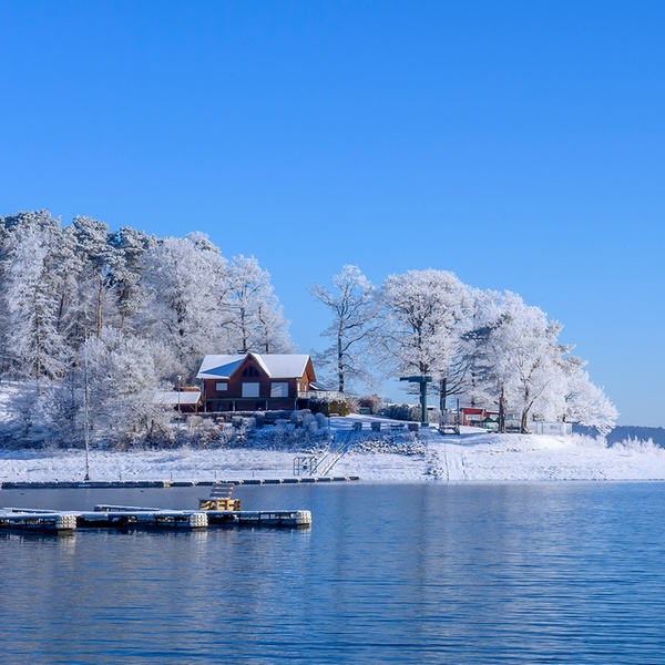 Das Ferienhaus Finntalos liegt direkt am Seeufer und bietet eine unverbauten Blick auf das Wasser. Die sieben Häuser befinden sich in unmittelbarer Nähe zueinander, jeweils mit großzügigen verglasten Fensterfronten. Seit 2025 steht jedem Haus ein eigenes SUP-Board zur Nutzung bereit.