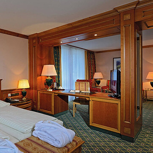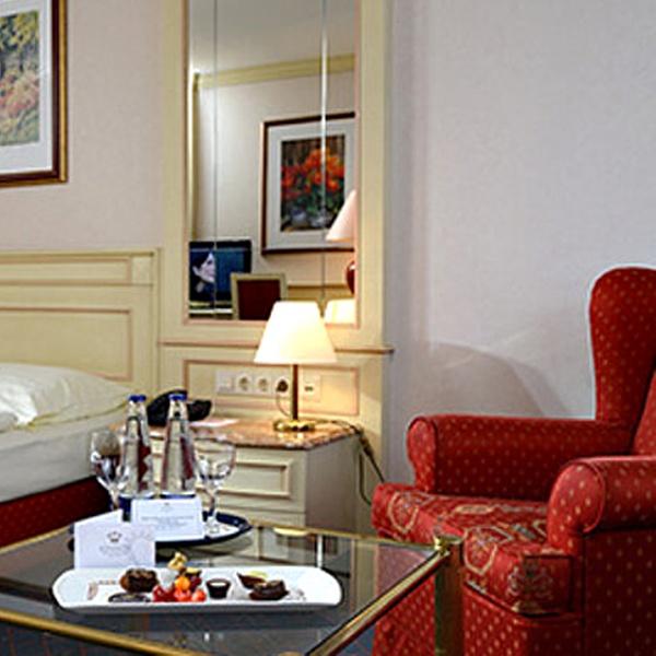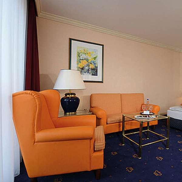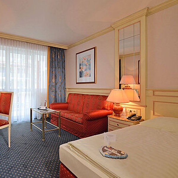 Junior Suite – ca. 40 m², Fl. Wasser, Sitzgruppe, Balkon. Bad/ Badewanne, Kosmetikartikeln, Fön. Telefon, Schreibtisch, Flachbildschirm-TV, Radio. Minibar, Bademantel, Slipper, Kaffee-/Tee Station, begehbarer Kleiderschrank, Safe