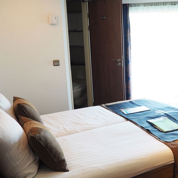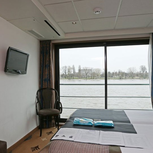 Alle 14 qm großen Kabinen liegen außen und sind komfortabel und elegant mit französischem Balkon, raum-hoher Fensterfront und Schiebetür eingerichtet. Die Betten lassen sich wahlweise als Doppel- oder Einzelbetten stellen. Die Kabinen sind mit Dusche/WC, Haarföhn, individuell regulierbarer Klimaanlage, SAT-TV (Flachbildschirm), Radio, Minibar, Safe, Telefon, Stromspannung 220 V Wechselstrom ausgestattet.