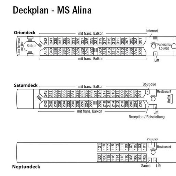 Mit lichtdurchfluteten Räumlichkeiten und gemütlichem Ambiente, sowie langen Tischzeiten, kreuzt das Schiff während der Adventszeit zwischen Köln und Rüdesheim. Das Schiff „MS Alina“ (oder „MS Amelia“) ist auf 4 Passagierdecks mit Panorama-Lounge-Bar, Lido-Heckbar mit Außenterrasse und Bistro ausgestattet. Außerdem verfügt das Schiff über ein großflächiges Sonnendeck inklusive Liegestühlen und Schatten-Plätzen, ein Shuffleboard, einen Pool und einen Bar-Service. Ein Restaurant, eine Schiff-Boutique, ein Ausflugsbüro, eine Leseecke sowie eine Aussichtsterrasse am Bug des Schiffes stehen den Reisenden zur Verfügung. Ein kleiner Fitness- und Wellness-Bereich mit Sauna und Dampfbad (gegen Gebühr), ein Wäscherei-Service und ein Internet-Cafe sind weitere Möglichkeiten, die die Gäste an Bord wahrnehmen können.