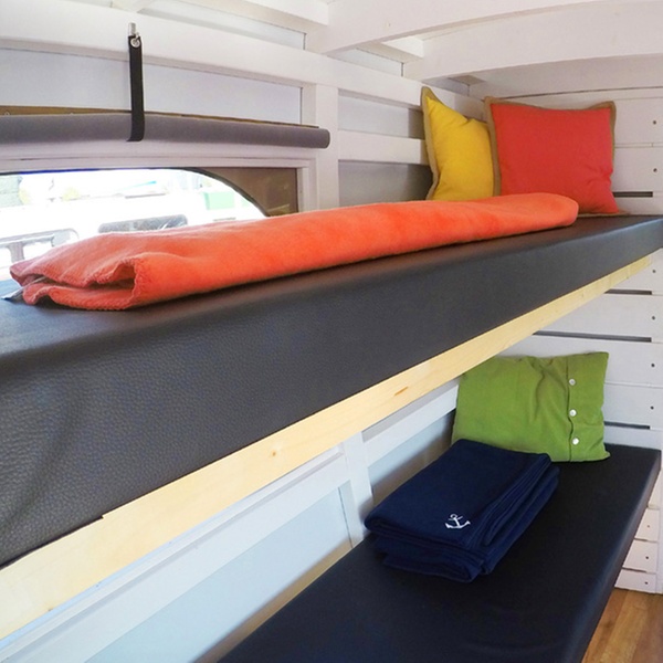 Zur Ausstattung gehören: 4 Schlafplätze, Sitzgruppe, Klapptisch, Kochgeschirr, Toaster, Wasserkocher, Gas-Kocher, Spülbecken mit fließend Wasser, Bord-WC mit Waschbecken, Bugterrasse mit Lounge, Kuscheldecken, Kissen und Heizung.