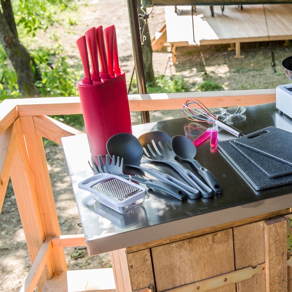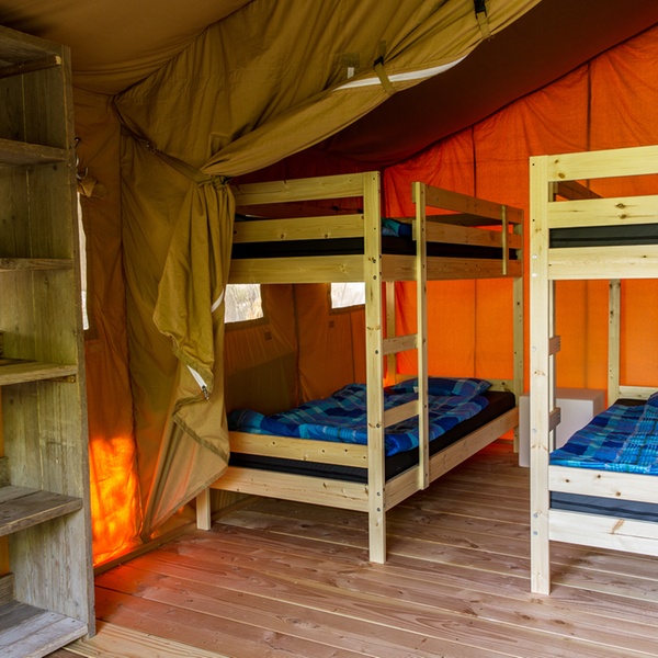 Die Safari-Zelte haben eine Fläche von etwa 25 m2 und bieten bis zu 6 Personen Platz. Die Zelte haben auch eine praktische, mobile Küche auf Rädern, so dass man draußen auf der Veranda kochen kann, sofern es das Wetter zulässt. Die mit einem Dach geschützte Veranda verfügt über einen Tisch und Stühle und hat eine Fläche von etwa 15 m2. Die Küche ist mit einem Gasherd mit 4 Kochstellen, Geschirr, Besteck, einem Kühlschrank und einer Kaffeemaschine ausgestattet. Die Zelte haben Strom und weisen zwei Schlafkabinen auf: eine mit einem Doppelbett und eine mit 2 Stockbetten.