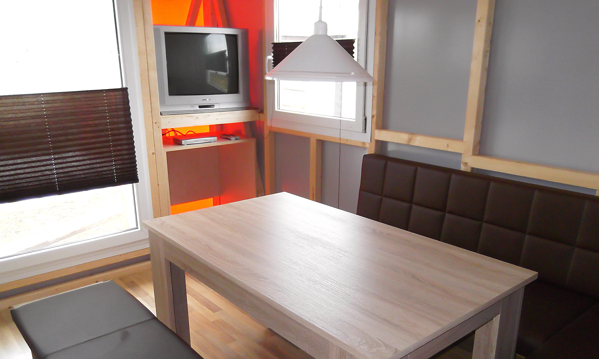 Einbauküchen, Laminatböden, TV, richtige Fenster und abschließbare Türen in den