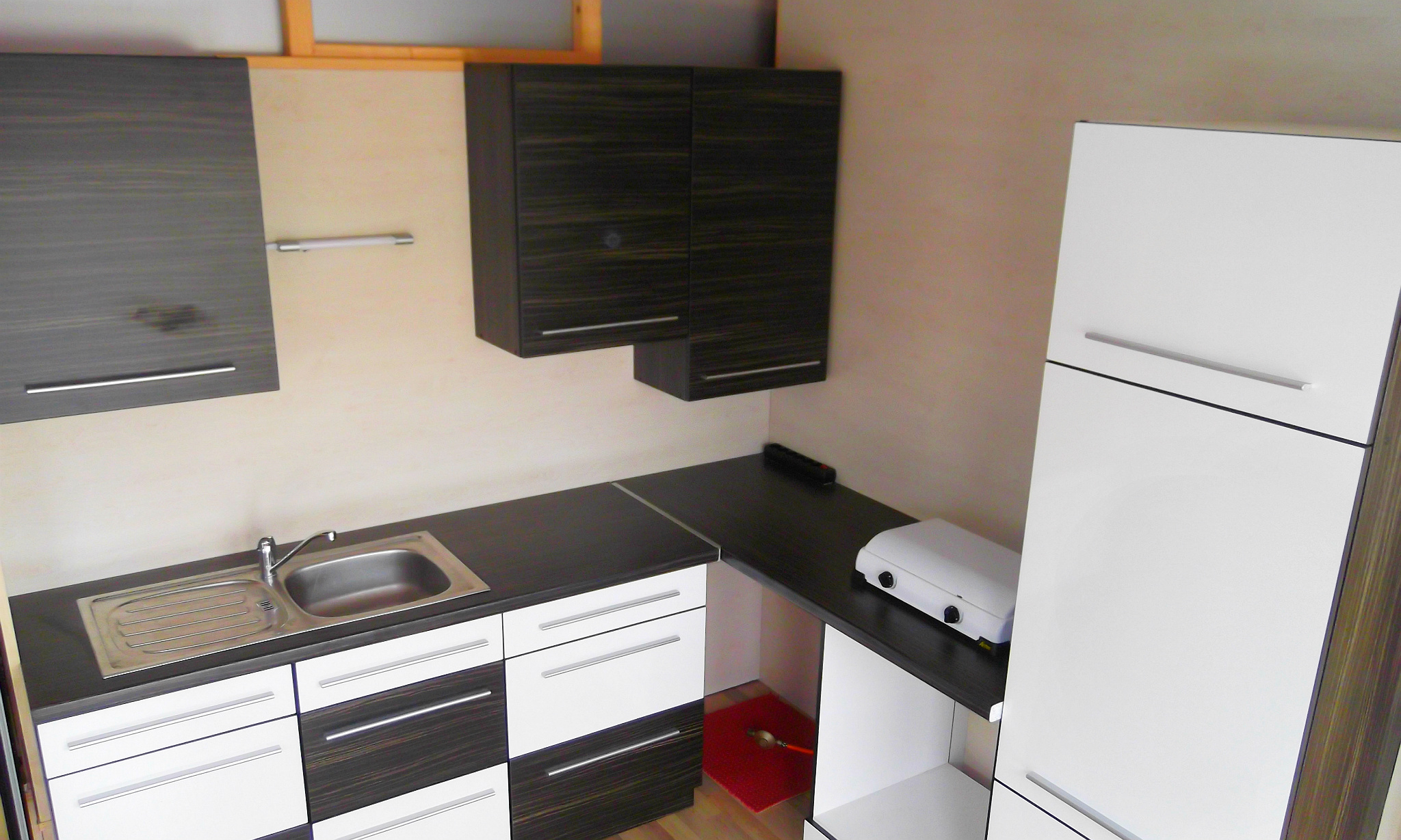 Waschtisch (angeschlossen an Frisch- u. Abwasser) in den Wohnwagen. Dazu kommen die