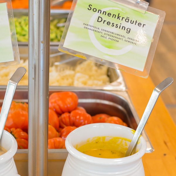 - Verpflegung (morgens zwischen 8 und 9, Obst zur Selbstbedienung, täglich 2x veganes Vollwertbuffet, während des ganzen Tages Tee und Wasser)