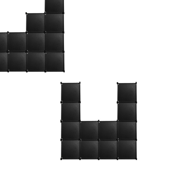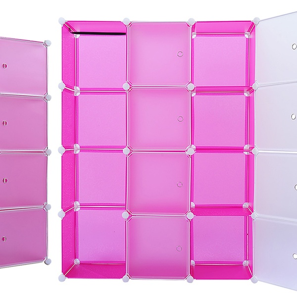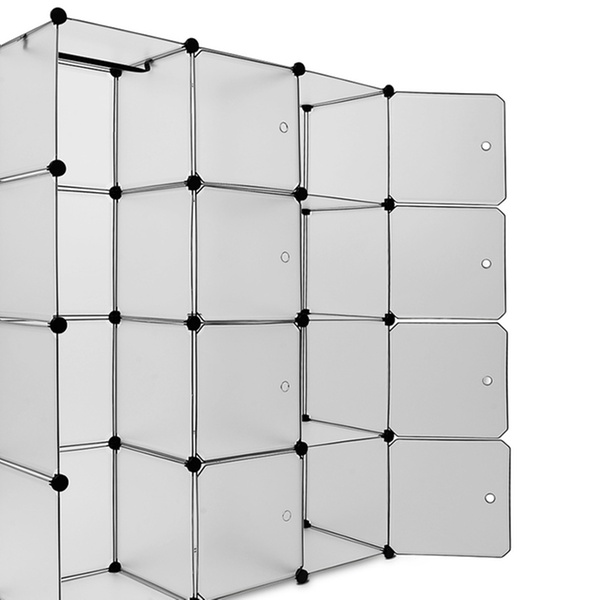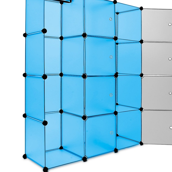 Das Regalbau-Set mit abnehmbaren Türen, integrierbarer Kleiderstange und 12 bzw. 20 teilweise verschließbaren Boxen ist schnell zu montieren