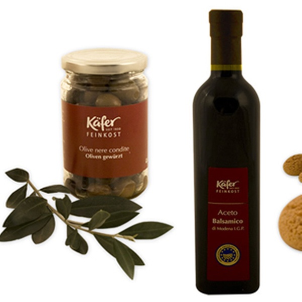 - Käfer Aceto Balsamico di Modena I.G.P.: Weinessig, gekochter Traubenmost, Farbstoff: E 150d
