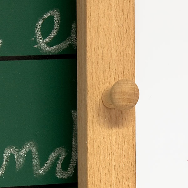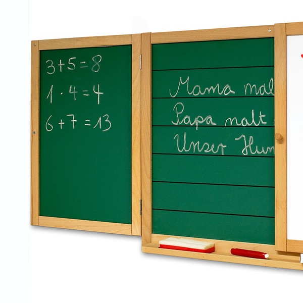 - Beidseitig nutzbar als Kreidetafel (großes Mittelfeld, 2 Flügel) und Magnettafel (2 Flügel, Rückseiten)