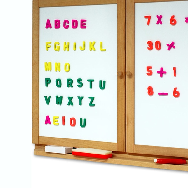 - Lieferumfang: 1 Magnettafel, 31 Magnetbuchstaben (A-Z + A, E, I, O, U), 10 Magnetziffern (0-9), 5 Magnetrechenzeichen (x, /, +, -, =), 10 weiße Kreidestifte, 1 Kreidehalter, 1 Schwamm, Montagematerial, Aufbauanleitung