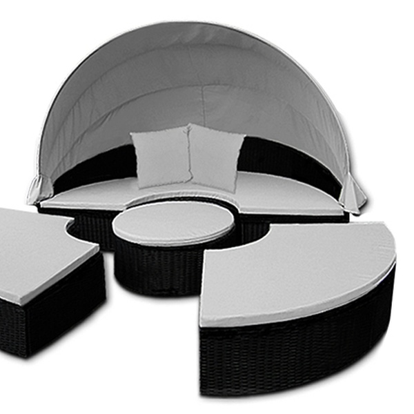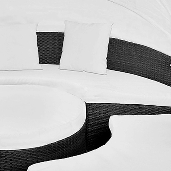 Auf der exklusiven Sonneninsel 230 läßt sich der Sommer im Garten oder auf der Veranda wie im Urlaub genießen. Das verwendete Poly-Rattan zeichnet sich durch Stabilität und Wetterfestigkeit aus. Das UV-lichtbeständige Material ist einfach zu reinigen. Unterbau und Sonnendach werden von einem robusten Metallgestell unterstützt. Verstellbare Schraubfüße gleichen Unebenheiten aus. Sämtliche Bezüge sind wasserabweisend beschichtet: Flüssigkeiten werden nicht sofort aufgesaugt und können daher leicht abgetupft werden. Dank verdeckter Reissverschlüsse sind die Bezüge abnehmbar und können gewaschen werden. Das Dach ist mittels Gasdruckzylindern faltbar und dient sowohl als Sonnen- wie auch Windschutz. Die einzelnen Elemente können individuell genutzt und platziert werden. Die Sonnenliege eignet sich für den Innenbereich genauso wie für den Außenbereich.